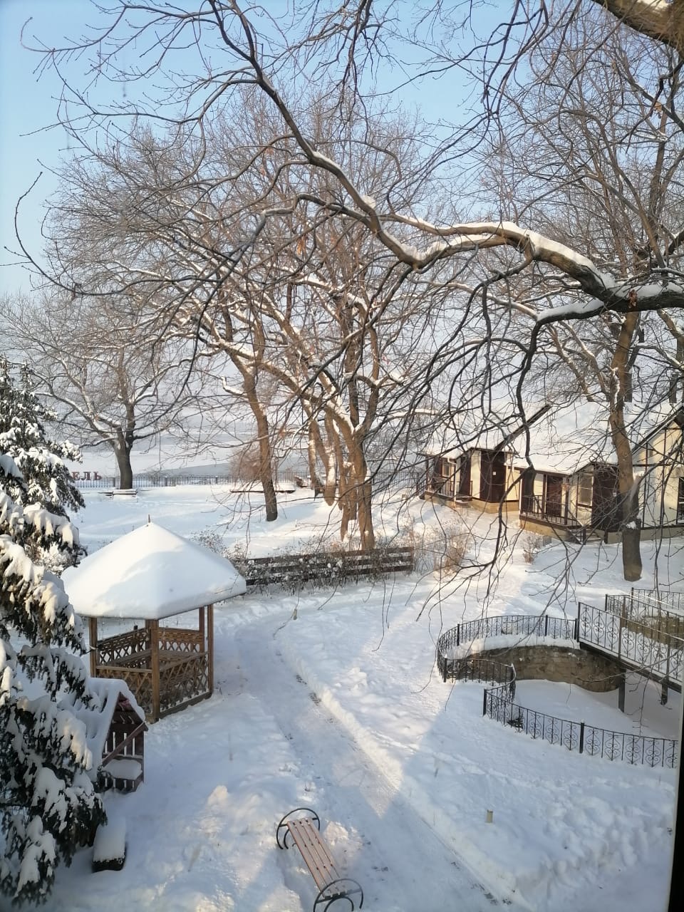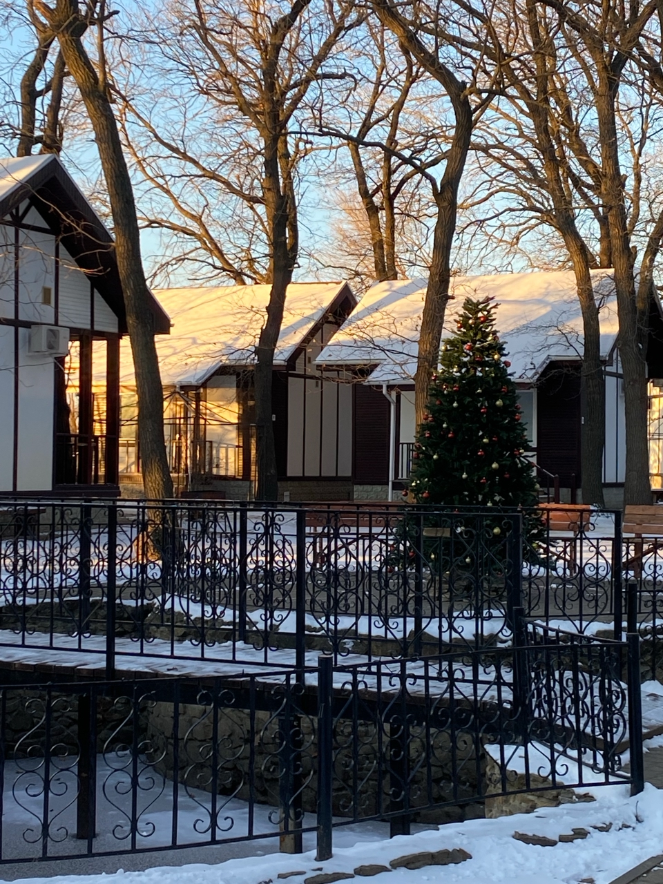 Отличное место! Отдыхали семьей с детьми- приехали бы еще раз! Чистая территория под сенью дубов, все ухожено. Виды отличные. Аккуратные домики, у многих мангальное место и терраса. Есть и корпуса, около главного- пруд с рыбками кои разного цвета, их можно покормить, купив корм. В нашем домике была комната и кухонная зона. Терраса со столом. Единственное, домики уже не первой свежести, но кондей есть...